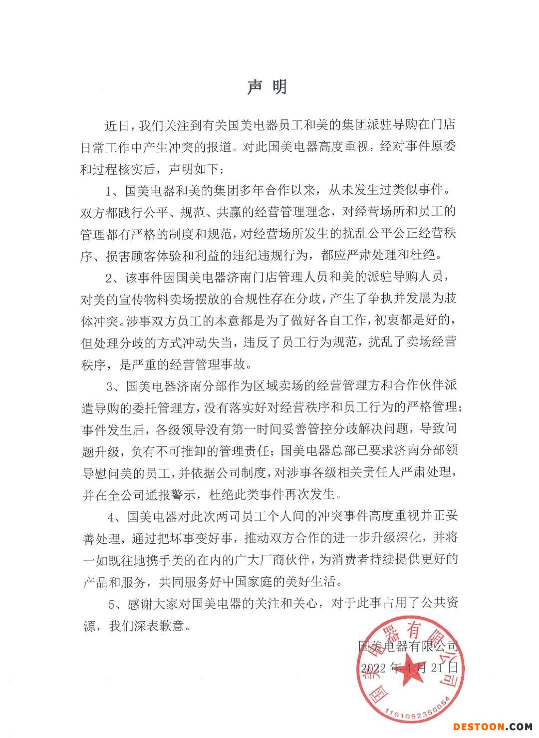 针对国美济南分部员工与美的员工发生冲突一事,4月21日晚,国美零售子公司国美电器发表官方声明称,公司对此次冲突事件高度重视并正妥善处理,将推动双方合作的进一步升级深化。