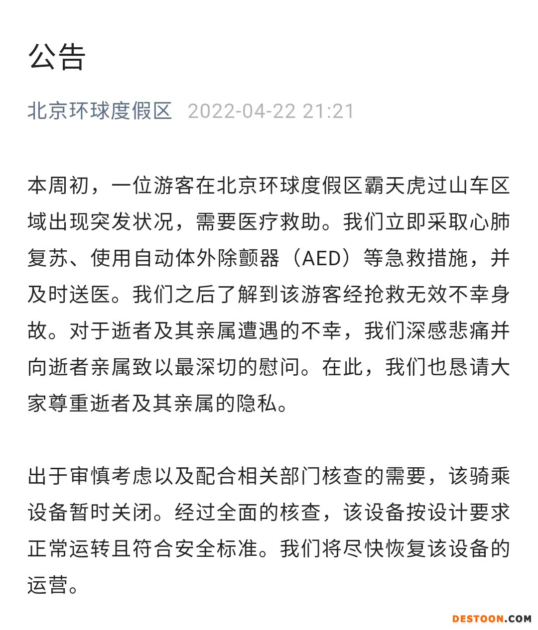 本周初,一位游客在北京环球度假区霸天虎过山车区域出现突发状况,需要医疗救助。我们立即采取心肺复苏、使用自动体外除颤器(AED)等急救措施,并及时送医。我们之后了解到该游客经抢救无效不幸身故。对于逝者及其亲属遭遇的不幸,我们深感悲痛并向逝者亲属致以最深切的慰问。在此,我们也恳请大家尊重逝者及其亲属的隐私。