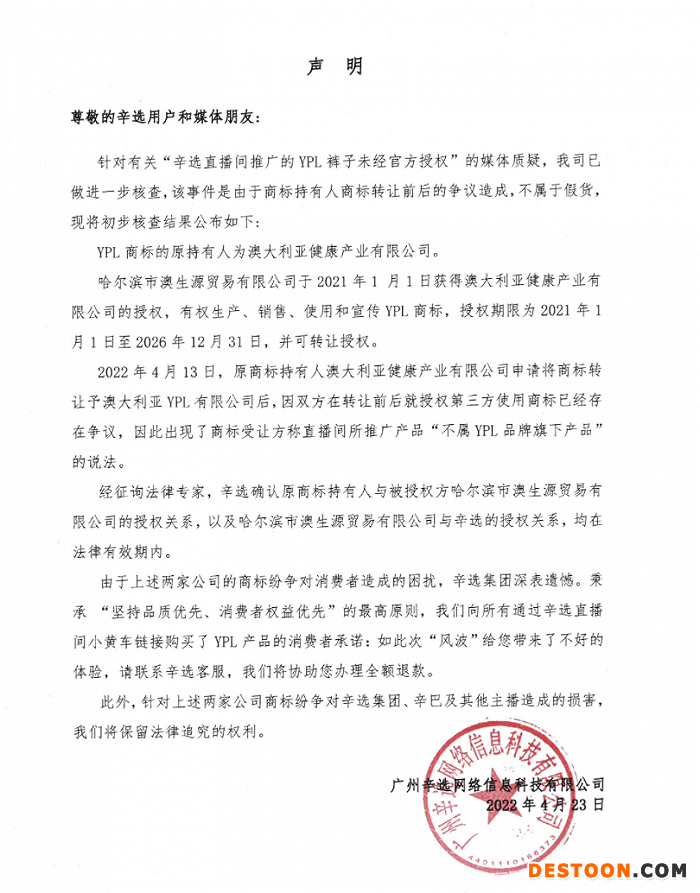 今日,辛选集团针对该事件发布最新回应,声明称:针对有关“辛选直播间推广的YPL裤子未经官方授权”的质疑,我司已做进一步核查,该事件是由于商标持有人商标转让前后的争议造成,不属于假货。