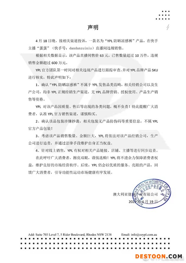 中新财经4月22日电 针对辛巴旗下快手主播“蛋蛋”直播间疑似卖假货一事,22日,“YPL运动潮品”回应称,“蛋蛋”所售产品不属于YPL发售品类范畴,相关经销公司以及生产公司,均非YPL正规经销生产渠道,无YPL品牌营销、授权使用、产品生产销售等资格。