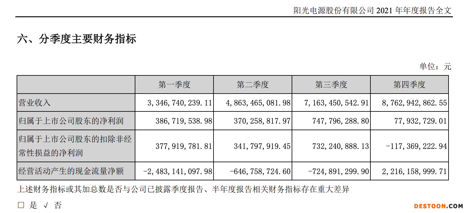 另据阳光电源19日发布的财报显示,2021年全年,阳光电源实现营业收入241.37亿元,同比增长25.15%,但净利润为15.83亿元,同比下降19.01%,特别是四季度盈利出现断崖式下滑,仅盈利7793万元,环比三季度7.48亿元,暴降近90%;据2022年一季报显示,阳光电源今年一季度净利润4.11亿元,仅同比微增6.26%。