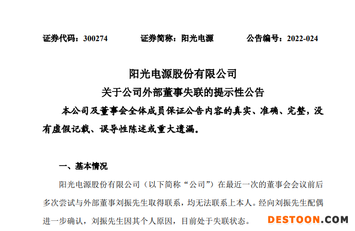 据阳光电源4月22日晚间公告消息,公司在最近一次的董事会会议前后多次尝试与外部董事刘振取得联系,均无法联系上本人。经向刘振配偶进一步确认,刘振因其个人原因,目前处于失联状态。