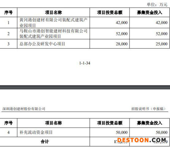 港创建材原拟在深交所主板公开发行不超过4701万股,原拟募集资金16.90亿元,分别用于黄冈港创建材有限公司装配式建筑产业园项目、马鞍山市港创智能建材科技有限公司装配式建筑产业园项目、总部办公及研发中心项目、补充流动资金项目。