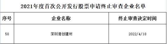 中国经济网北京4月24日讯 据证监会网站消息,证监会决定终止对深圳港创建材股份有限公司(以下简称“港创建材”)首次公开发行股票申请。