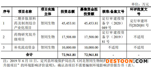 智同生物原拟在上交所主板公开发行不超过4250万股,不低于本次发行完成后股份总数的25%,原拟募集资金7.30亿元,分别用于二期多肽原料药及制剂综合产业化项目、药物研究院升级项目、补充流动资金。