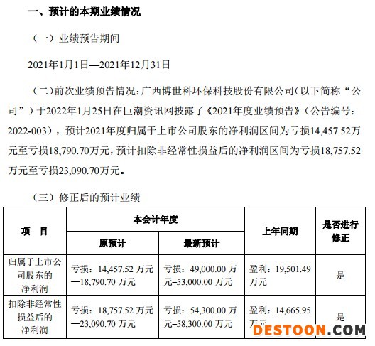 22日晚间,创业板上市公司博世科同样发布了2021年度业绩预告修正公告,公告显示,2022年1月25日,公司披露的业绩预告为预计2021年度归属于上市公司股东的净利润区间为亏损1.4亿元-1.88亿元,修正后的业绩预告为预计亏损4.9亿元-5.3亿元。