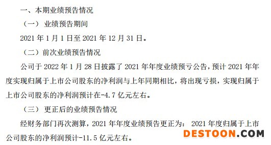 对于业绩预告更正的原因,公司表示,公司对2021年存在减值迹象的资产计提了减值准备约22.66亿元,预计导致归属于上市公司所有者的净利润减少约7.45亿元。