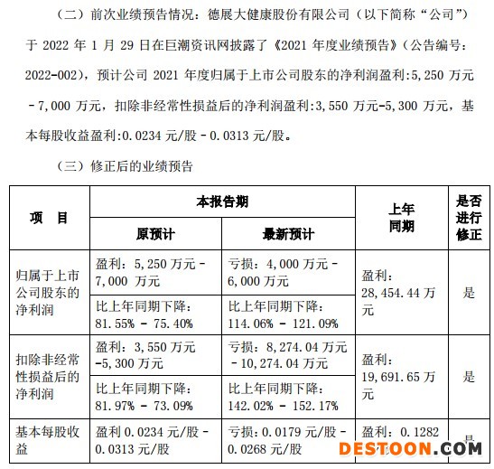 德展健康(000813)周五晚间发布的2021年度业绩预告修正公告显示,修正后的业绩为预计亏损4000万元-6000万元,此前预计盈利5250万元-7000万元。