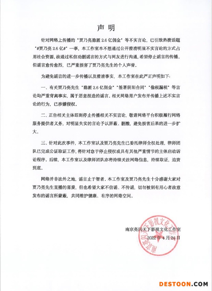 声明还称,有关贾乃亮“隐匿2.6亿佣金”“签署阴阳合同”“偷税漏税”等言论均严重背离事实,属于恶意捏造的谣言。相关网络用户发布并传播上述不实言论的行为,已涉嫌侵权。工作室及贾乃亮已委托律师全权处理,将针对怠于停止侵权或具有其他严重情节的主体启动诉讼程序。