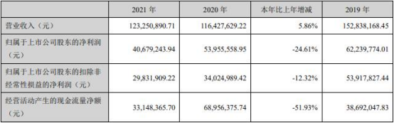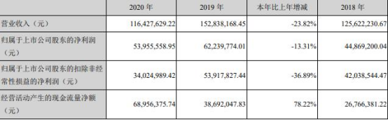 日月明上市后净利连降2年。2020年,公司实现营业收入1.16亿元,同比减少23.82%;实现归属于上市公司股东的净利润5395.56万元,同比减少13.31%;实现归属于上市公司股东的扣除非经常性损益的净利润3402.50万元,同比减少36.89%;经营活动产生的现金流量净额为6895.64万元,同比增长78.22%。