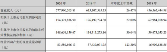 2020年,公司实现营业收入7.78亿元,同比增长26.47%;实现归属于上市公司股东的净利润1.54亿元,同比增长22.00%;实现归属于上市公司股东的扣除非经常性损益的净利润1.49亿元,同比增长30.04%;经营活动产生的现金流量净额为8358.06万元,同比增长123.30%。
