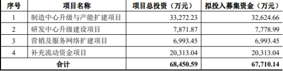 狄耐克募集资金总额为7.46亿元,扣除发行费用后,募集资金净额为6.96亿元。 狄耐克最终募集资金净额较原计划多1920.27万元。招股说明书显示,公司拟募集资金6.77亿元,分别用于制造中心升级与产能扩建项目、研发中心升级建设项目、营销及服务网络扩建项目及补充流动资金项目。