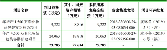 锦盛新材募集资金总额为3.50亿元,募集资金净额为2.93亿元,其中9222万元用于年增产1500万套化妆品包装容器技改项目,2.01亿元用于年产4500万套化妆品包装容器新建项目。
