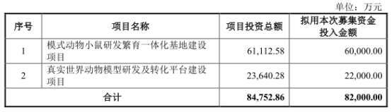 药康生物本次发行募集资金总额为11.27亿元,募集资金净额为10.26亿元。药康生物最终募集资金净额比原计划多2.06亿元。4月18日,药康生物披露的招股说明书显示,公司拟募集资金8.20亿元,分别用于模式动物小鼠研发繁育一体化基地建设项目、真实世界动物模型研发及转化平台建设项目。