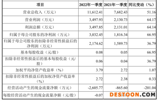 2022年1-3月,公司营业收入为11,612.41万元,同比增长51.16%;归属于母公司股东的净利润3,032.45万元,同比增长66.95%;归属于母公司股东的扣除非经常性损益后的净利润2,174.62万元,同比增长36.79%;经营活动产生的现金流量净额-2,605.77万元,同比减少201.04%。