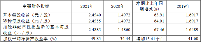 2021年,水井坊基本每股收益为2.4540元/股,较上年同期增长63.91%;加权平均净资产收益率为49.85%,较上年同期增加15.41个百分点。