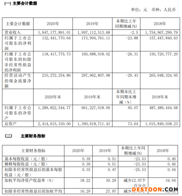 2020年,一鸣食品业绩下降。2020年公司实现营业收入19.47亿元,同比减少2.50%;实现归属于上市公司股东的净利润1.32亿元,同比减少23.88%;实现归属于上市公司股东的扣除非经常性损益的净利润1.18亿元,同比减少26.31%;经营活动产生的现金流量净额为2.10亿元,同比减少29.43%。