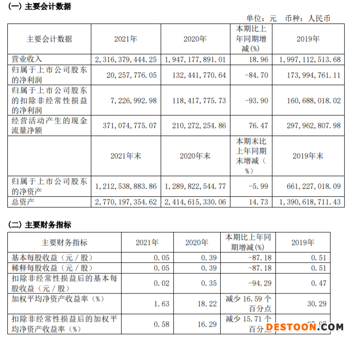 中国经济网北京4月25日讯 近日,一鸣食品(605179.SH)披露了2021年年度报告。2021年,公司实现营业收入23.16亿元,同比增加18.96%;归属于上市公司股东的净利润2025.78万元,同比减少84.70%;归属于上市公司股东的扣除非经常性损益的净利润722.70万元,同比减少93.90%;经营活动产生的现金流量净额为3.71亿元,同比增长76.47%。