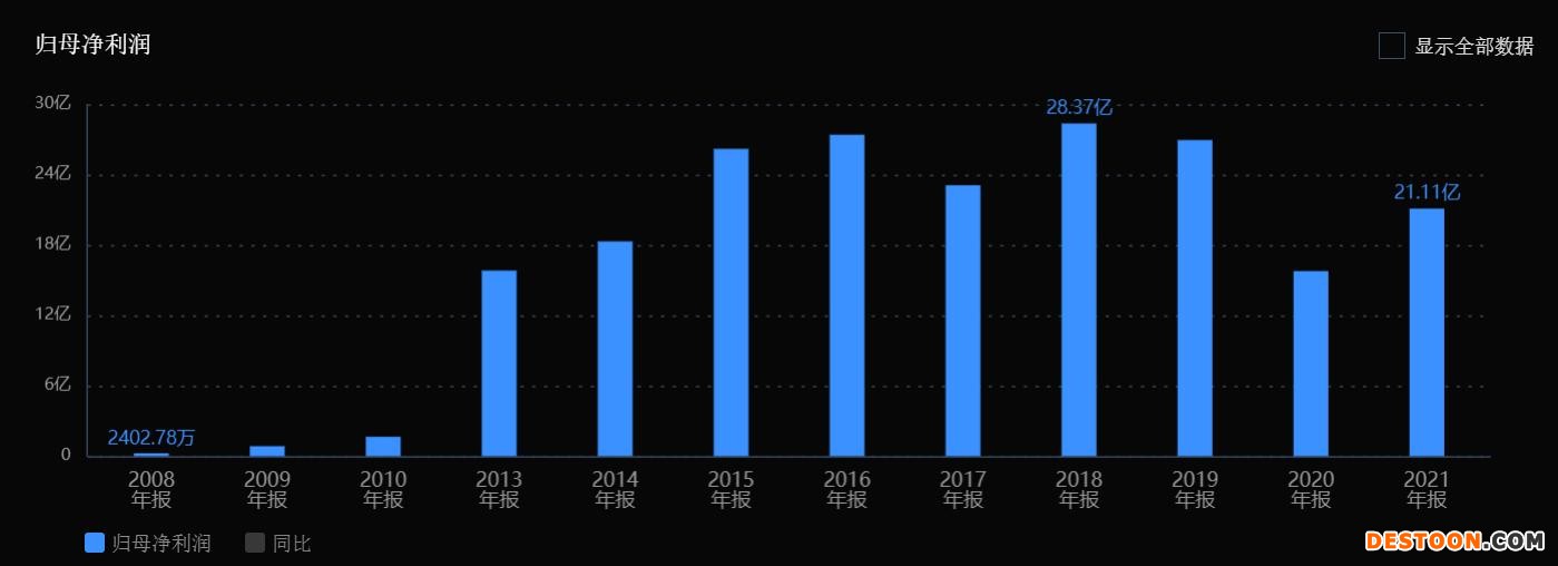 实际上,拉到更长的时间来看,单就归母净利润这一项,养元饮品2008年即开始爆发式增长至2015年。 数据显示,2008年公司实现归母净利润2402.78万元,至2015年时,已达26.20亿元。