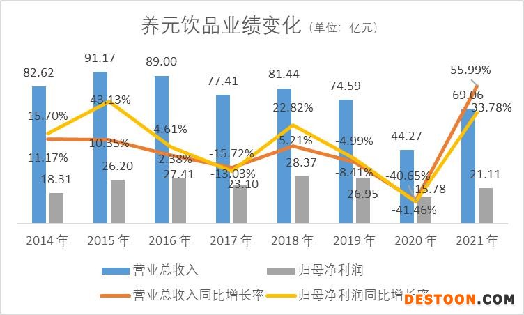 养元饮品2021年业绩的高增长与2020年业绩低基数密切相关。数据显示,公司2020年实现营收约44.27亿元,同比下降40.65%,实现归母净利润约15.78亿元,同比下降约41.46%,为近八年来最低值。