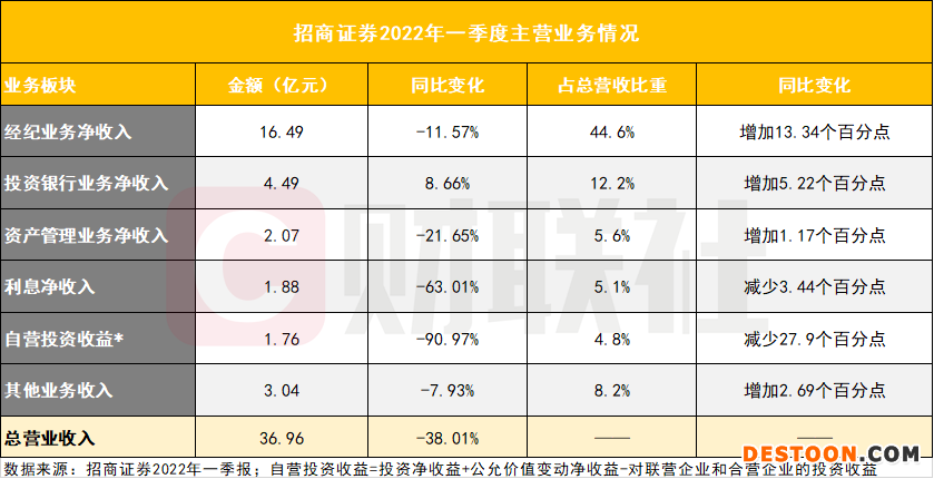 2022年一季报显示,招商证券营业收入、归母净利润分别呈现四成左右的同比下滑。从各业务板块的表现来看,也呈现一定程度的收入结构分化。