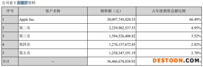 事实上,除了营运能力下滑、盈利能力减弱等问题外,蓝思科技还患上了严重的大客户依赖症。报告显示,苹果对于蓝思科技的销售收入贡献高达300.98亿元,占年度销售总额的比例高达66.49%。近年来,“果链”公司由于被踢出苹果供应链而出现业绩爆雷的案例不少见,例如:2021年3月被苹果终止合作的欧菲光(002456),就预计2021年度净利润亏损最高为27亿元。