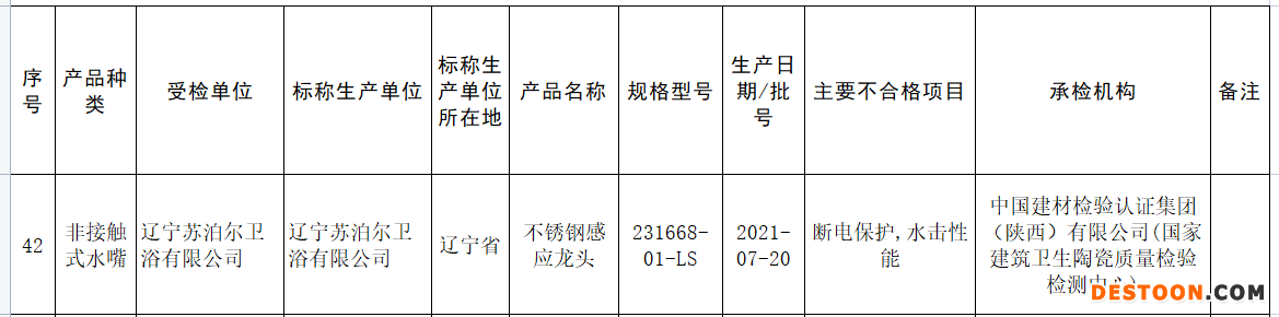 非接触式水嘴抽查结果显示,标称辽宁苏泊尔卫浴有限公司生产的不锈钢感应龙头不合格,主要不合格项目为断电保护,水击性能。其规格型号为231668-01-LS,生产日期/批号为2021-07-20,受检单位为辽宁苏泊尔卫浴有限公司,承检机构为中国建材检验认证集团(陕西)有限公司(国家建筑卫生陶瓷质量检验检测中心)。