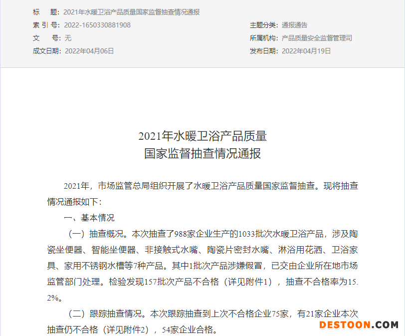 中国经济网北京4月25日讯 近日,国家市场监督管理总局网站公布了《2021年水暖卫浴产品质量国家监督抽查情况通报》。2021年,市场监管总局组织开展了水暖卫浴产品质量国家监督抽查。本次抽查了988家企业生产的1033批次水暖卫浴产品,涉及陶瓷坐便器、智能坐便器、非接触式水嘴、陶瓷片密封水嘴、淋浴用花洒、卫浴家具、家用不锈钢水槽等7种产品。其中1批次产品涉嫌假冒,已交由企业所在地市场监管部门处理。检验发现157批次产品不合格,抽查不合格率为15.2%。