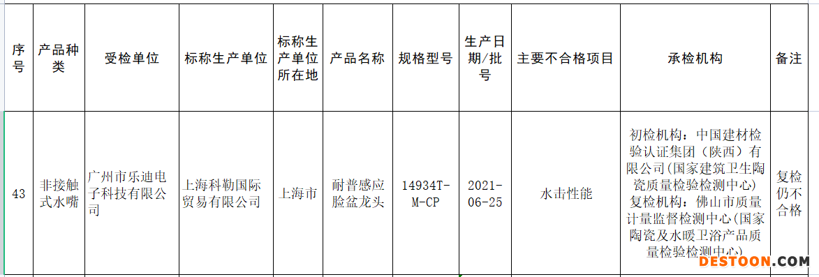 同时,标称上海科勒国际贸易有限公司生产的耐普感应脸盆龙头不合格,复检仍不合格,主要不合格项目为水击性能。其规格型号为14934T-M-CP,生产日期/批号为2021-06-25,受检单位为广州市乐迪电子科技有限公司,初检机构为中国建材检验认证集团(陕西)有限公司(国家建筑卫生陶瓷质量检验检测中心) ,复检机构为佛山市质量计量监督检测中心(国家陶瓷及水暖卫浴产品质量检验检测中心)。