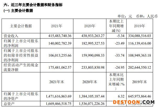 中国经济网北京4月25日讯 4月22日,蓝特光学(688127.SH)发布2021年年度报告。2021年,蓝特光学实现营业收入4.15亿元,同比下滑5.34%;归属于上市公司股东的净利润1.40亿元,同比下滑23.49%;归属于上市公司股东的扣除非经常性损益的净利润1.06亿元,同比下滑33.74%;经营活动产生的现金流量净额1.75亿元,同比下滑24.95%。