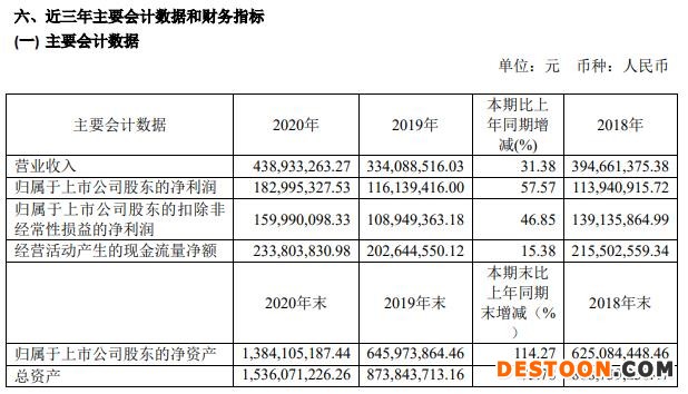 2020年,蓝特光学实现营业收入4.39亿元,同比增长31.38%;归属于上市公司股东的净利润1.83亿元,同比增长57.57%;归属于上市公司股东的扣除非经常性损益的净利润1.60亿元,同比增长46.85%;经营活动产生的现金流量净额2.34亿元,同比增长15.38%。
