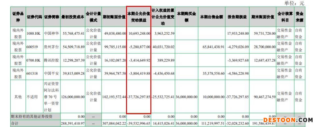 报告期内,除中国神华公允价值变动为1069万元,其余三只股票均为亏损。贵州茅台、腾讯控股、中国平安公允价值变动分别为-528万元、-341万元、-380万元。