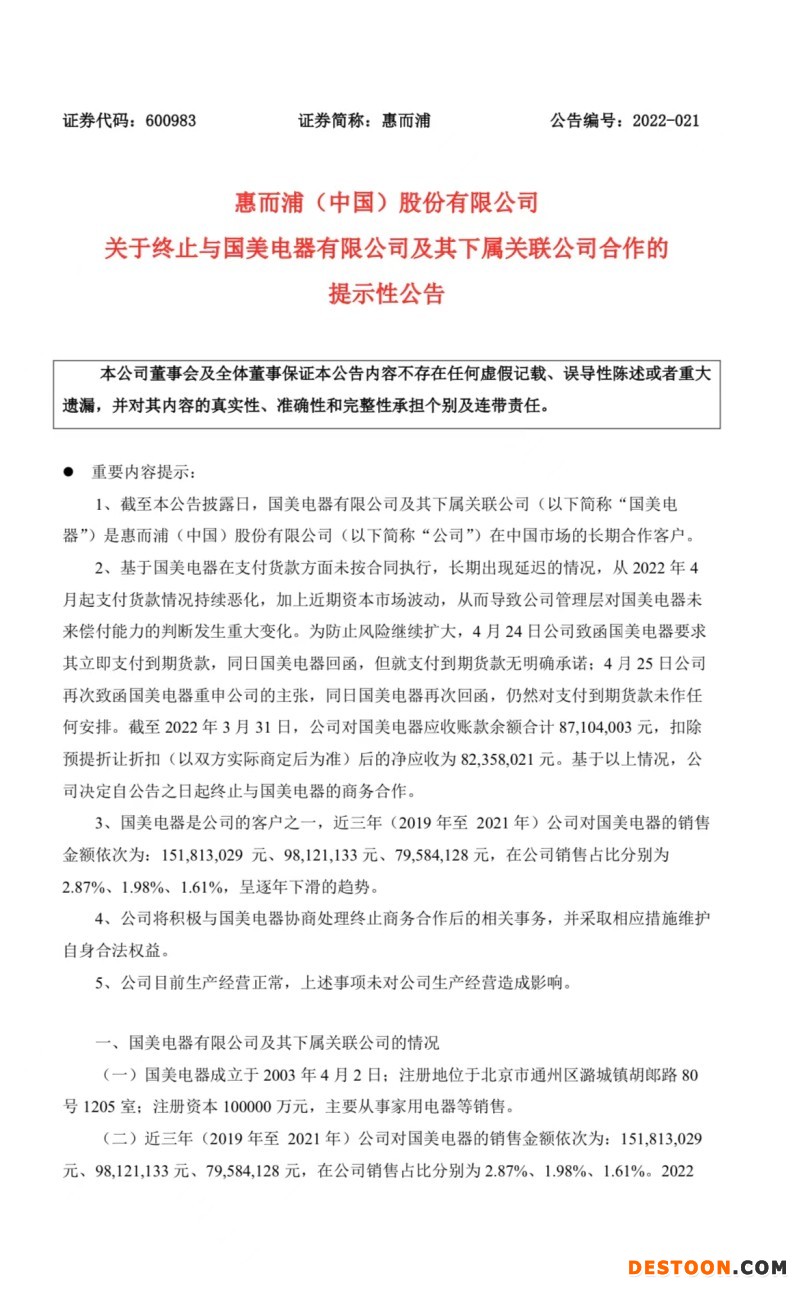 公告显示,基于国美电器在支付货款方面未按合同执行,长期出现延迟的情况,从2022年4月起支付货款情况持续恶化;截至2022年3月31日,公司对国美电器应收账款余额合计8710.4万元,公司决定自公告之日起终止与国美电器的商务合作。