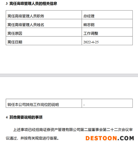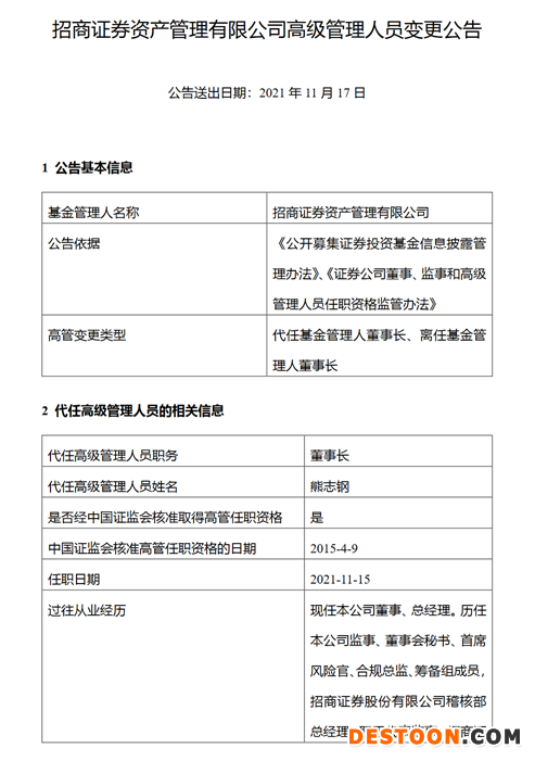 另据公告披露,熊志钢同日卸任总经理一职,原因为“工作调整”。值得注意的是,2021年11月15日,招商资管曾公告,因原招商证券副总裁、招商资管董事长邓晓力因到龄辞任,由熊志钢代任招商资管董事长一职。