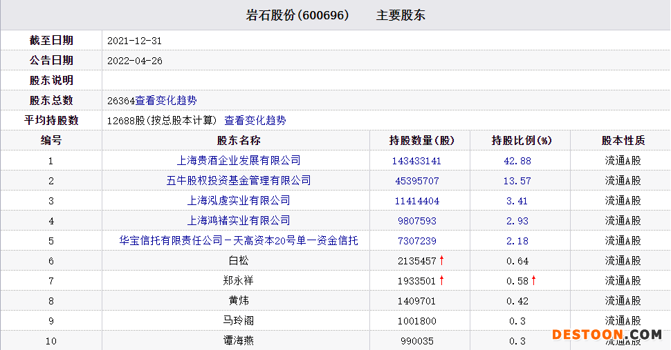 截至2021年12月31日,岩石股份前十大股东中没有任何一家公募基金公司现身。第一大股东上海贵酒企业发展有限公司,持有上市公司1.43亿股,持股比例为42.88%。
