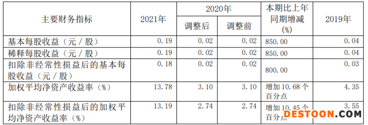2021年,岩石股份的基本每股收益为0.19元,同比增长850.00%;加权平均净资产收益率为13.78%,比上年同期增加10.68个百分点。