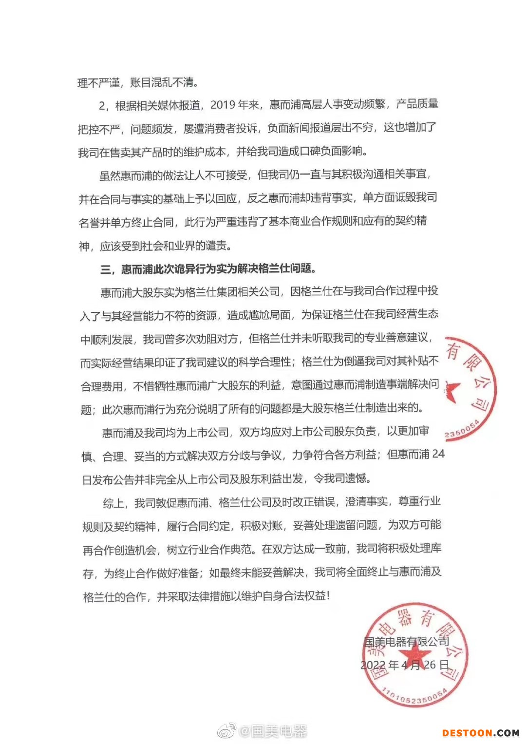 4月26日,针对惠而浦(600983)公告终止与国美电器合作事宜,国美电器发布声明回应称,公司不存在延迟支付货款情况,而是惠而浦管理混乱,长期未按合同履行义务。