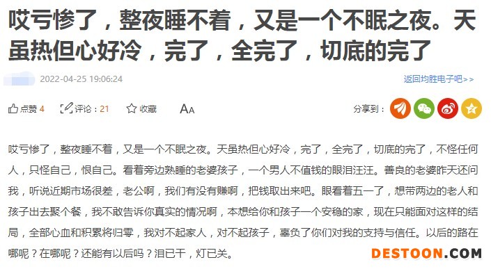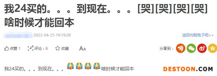 有网友在股吧中表示,我24买的,啥时候才能回本?还有的表示,哎亏惨了,整夜睡不着,又是一个不眠之夜。天虽热但心好冷,完了,全完了,切底的完了。