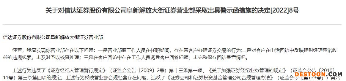公告显示,辽宁证监局发现信达证券股份有限公司阜新解放大街证券营业部存在以下问题:一是营业部原工作人员在任职期间,存在替客户办理证券交易的行为;二是对客户在电话回访中反映理财经理承诺收益的违规线索,未及时予以核查处理;三是在客户回访中存在工作人员诱导客户回答问题、未完整保存回访录音情况。