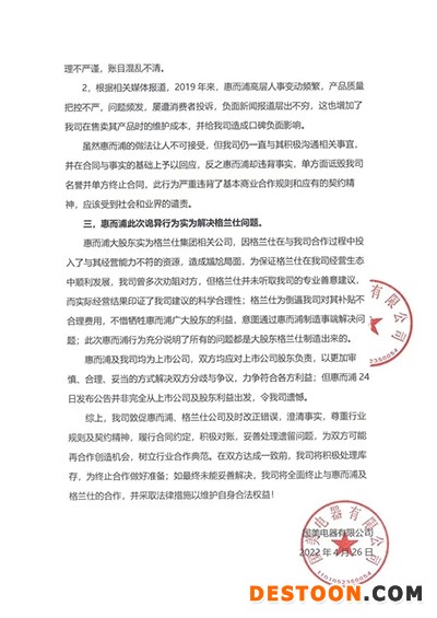 据4月25日晚间,惠而浦(中国)公告称,基于于国美电器在支付货款方面未按合同执行,长期出现延迟的情况,从2022年4月起支付货款情况持续恶化;截至2022年3月31日,公司对国美电器应收账款余额合计8710.4万元,公司决定自公告之日起终止与国美电器的商务合作。