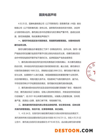 中国网科技4月26日讯 (记者 杨月月)针对25日晚间惠而浦(中国)发布公告称,终止与国美电器合作消息,国美电器今日早间发布声明回应表示:“公司不存在延迟支付货款情况,而是惠而浦长期未按合同履行义务。”