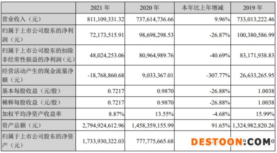 中国经济网北京4月26日讯 昨日晚间,迈赫股份(301199.SZ)发布2021年年度报告,公司2021年实现营业收入8.11亿元,同比增长9.96%;归属于上市公司股东的净利润为7217.35万元,同比下降26.87%;归属于上市公司股东的扣除非经常性损益的净利润4802.43万元,同比下降40.69%;经营活动产生的现金流量净额为-1876.89万元,同比减少307.77%。