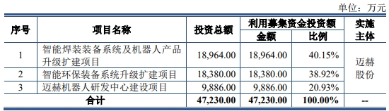 迈赫股份募集资金总额为9.76亿元,实际募集资金净额为8.84亿元,迈赫股份最终募集资金净额较原计划多4.12亿元。迈赫股份2021年12月2日发布的招股书显示,公司拟募集资金4.72亿元,分别用于智能焊装装备系统及机器人产品升级扩建项目、智能环保装备系统升级扩建项目、迈赫机器人研发中心建设项目。