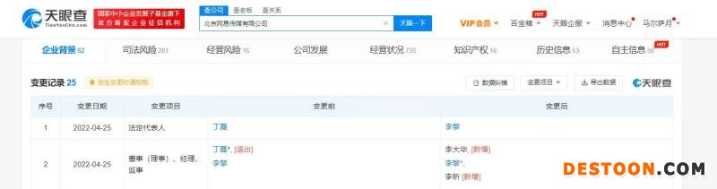 蓝鲸TMT频道4月26日讯,据天眼查,4月25日,北京网易传媒有限公司发生工商变更,丁磊退出法定代表人及总经理、董事职务,由网易传媒CEO李黎接任。