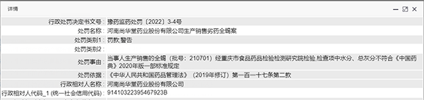 中国网财经4月26日讯(记者 杜丁)日前,河南省药监局连发两则行政处罚决定书,河南尚华堂药业股份有限公司因生产销售劣药全蝎、葛根,被合计罚款32万元。