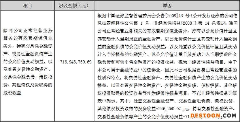 国元证券解释称,由于公司属于金融行业中的证券业,因此本公司根据自身正常经营业务的性质和特点,将交易性金融资产、交易性金融负债产生的公允价值变动损益,以及处置交易性金融资产、交易性金融负债、债权投资、其他债权投资取得的投资收益等作为经常性损益项目,不在非经常性损益计算表中列示。其中:处置交易性金融资产、交易性金融负债、债权投资、其他债权投资取得的投资收益-24.63万元,持有交易性金融资产、交易性金融负债等产生的公允价值变动损益-7.17亿元。