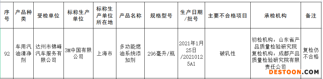 车用汽油清净剂抽查结果显示,标称3M中国有限公司生产的多功能燃油系统添加剂不合格,复检仍不合格,主要不合格项目为破乳性。其规格型号为296毫升/瓶,生产日期/批号为2021年1月25日/20210125A1,受检单位为达州市锦峰汽车服务有限公司,初检机构为山东省产品质量检验研究院,复检机构为成都产品质量检验研究院有限责任公司。