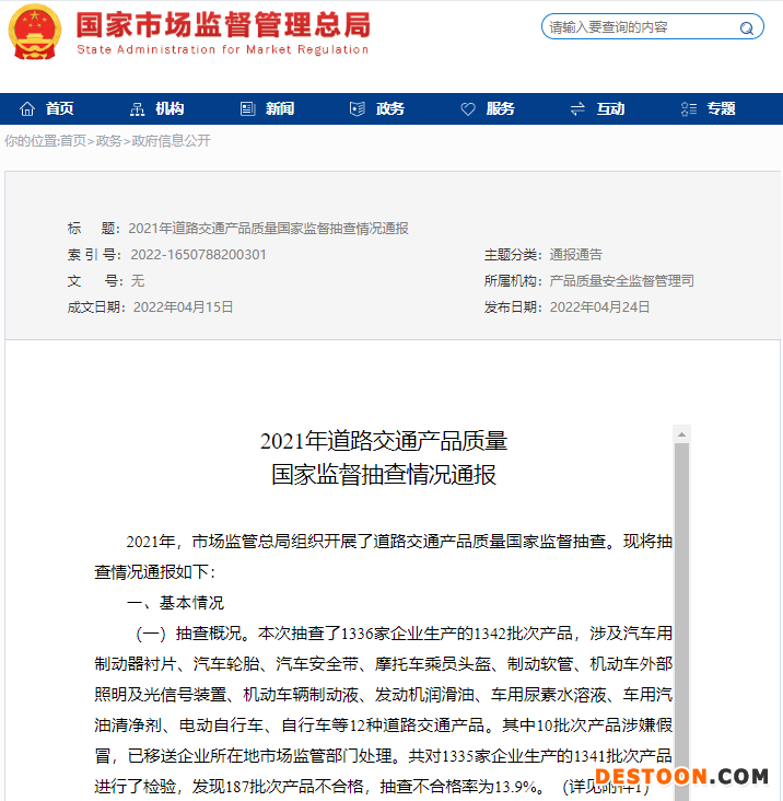 中国经济网北京4月26日讯 4月24日,国家市场监管总局网站公布了《2021年道路交通产品质量国家监督抽查情况通报》。2021年,市场监管总局组织开展了道路交通产品质量国家监督抽查。本次抽查了1336家企业生产的1342批次产品,涉及汽车用制动器衬片、汽车轮胎、汽车安全带、摩托车乘员头盔、制动软管、机动车外部照明及光信号装置、机动车辆制动液、发动机润滑油、车用尿素水溶液、车用汽油清净剂、电动自行车、自行车等12种道路交通产品。其中10批次产品涉嫌假冒,已移送企业所在地市场监管部门处理。共对1335家企业生产的1341批次产品进行了检验,发现187批次产品不合格,抽查不合格率为13.9%。