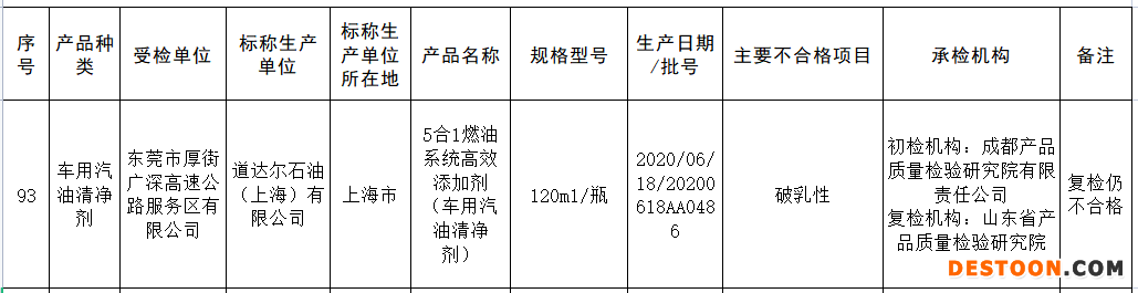 同时,标称道达尔石油(上海)有限公司生产的5合1燃油系统高效添加剂(车用汽油清净剂)不合格,复检仍不合格,主要不合格项目为破乳性。其规格型号为120ml/瓶,生产日期/批号为2020/06/18/20200618AA0486,受检单位为东莞市厚街广深高速公路服务区有限公司,初检机构为成都产品质量检验研究院有限责任公司,复检机构为山东省产品质量检验研究院。