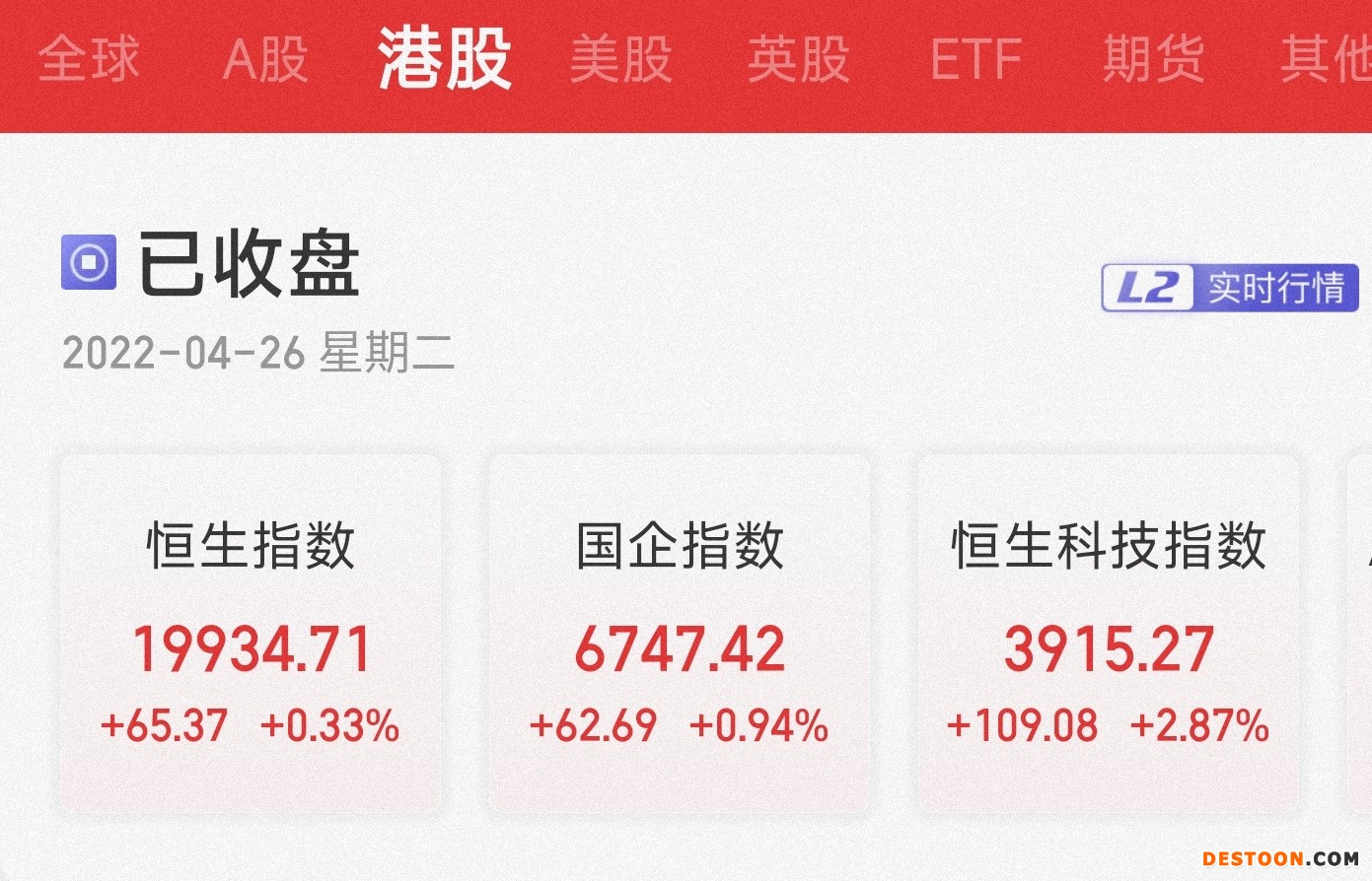 中新经纬4月26日电 26日,恒指高开,此后涨幅收窄。截至收盘,恒指收涨0.33%,报19934.71点;恒生科技指数收涨2.87%,报3915.27点。